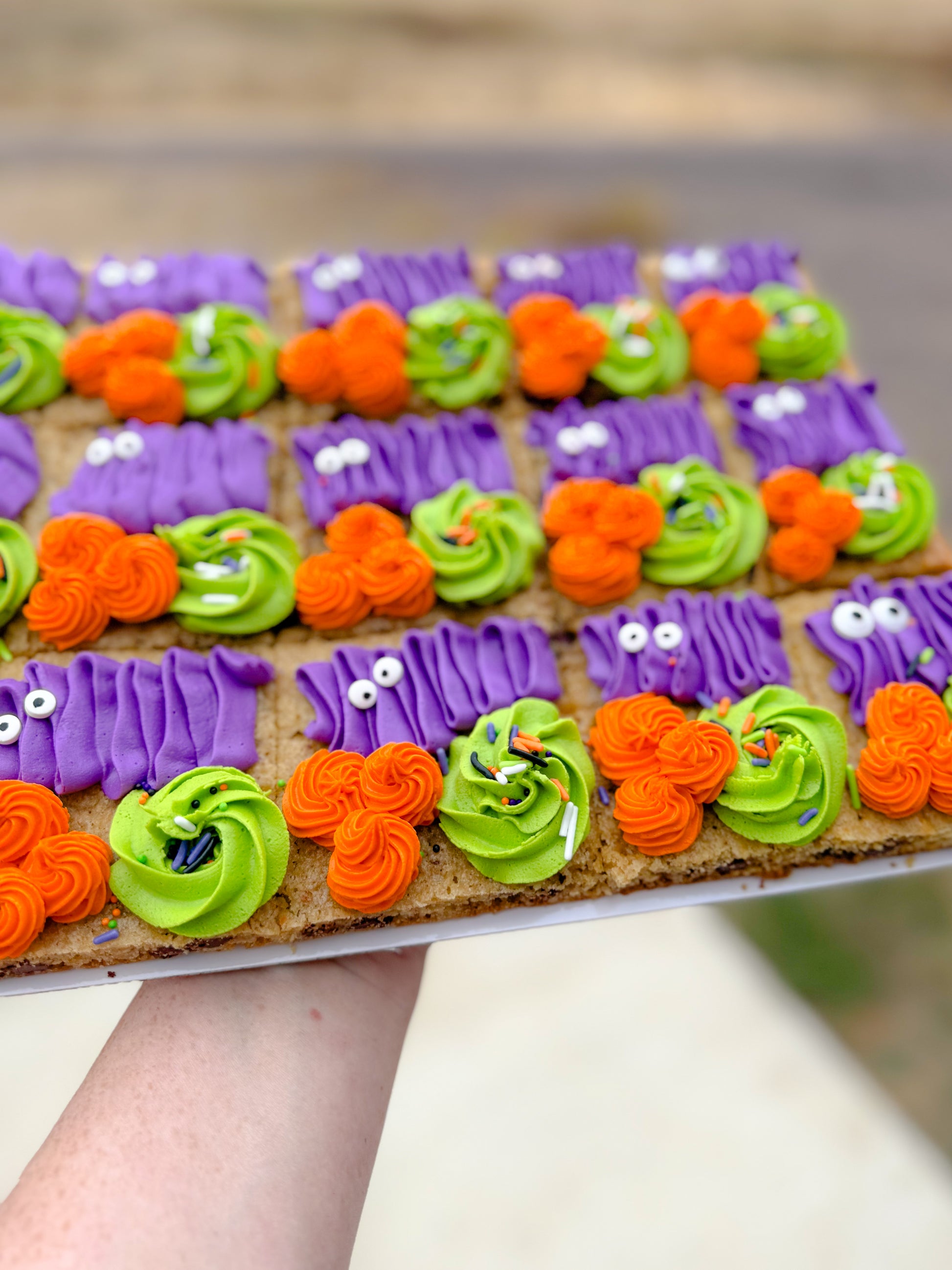 Our delicious chocolate chip cookie cake is the perfect addition to your Halloween festivities. Each cake is pre-cut into individual mini-cake portions! All portions are decorated the same and this makes it easy for serving large crowds.