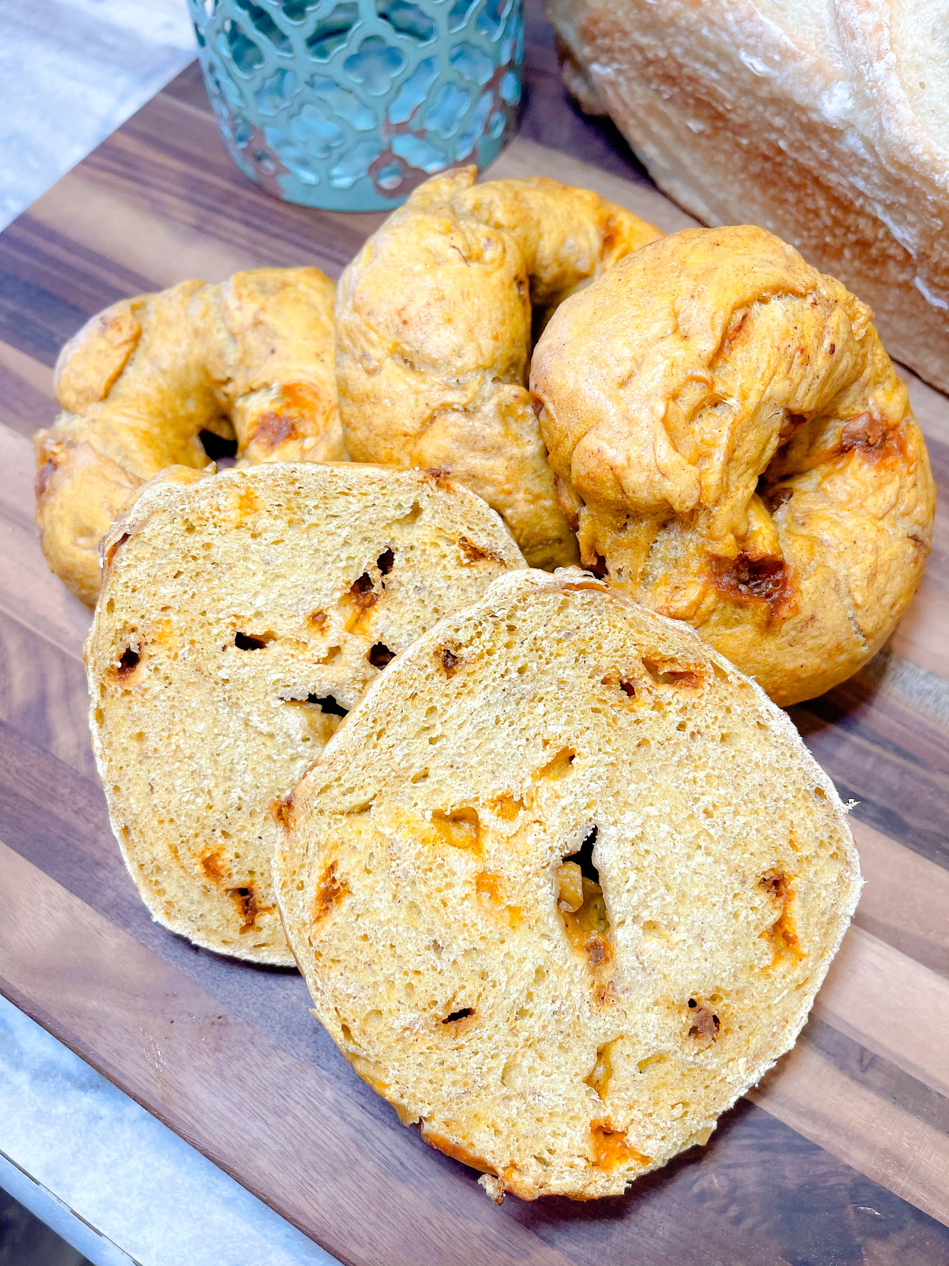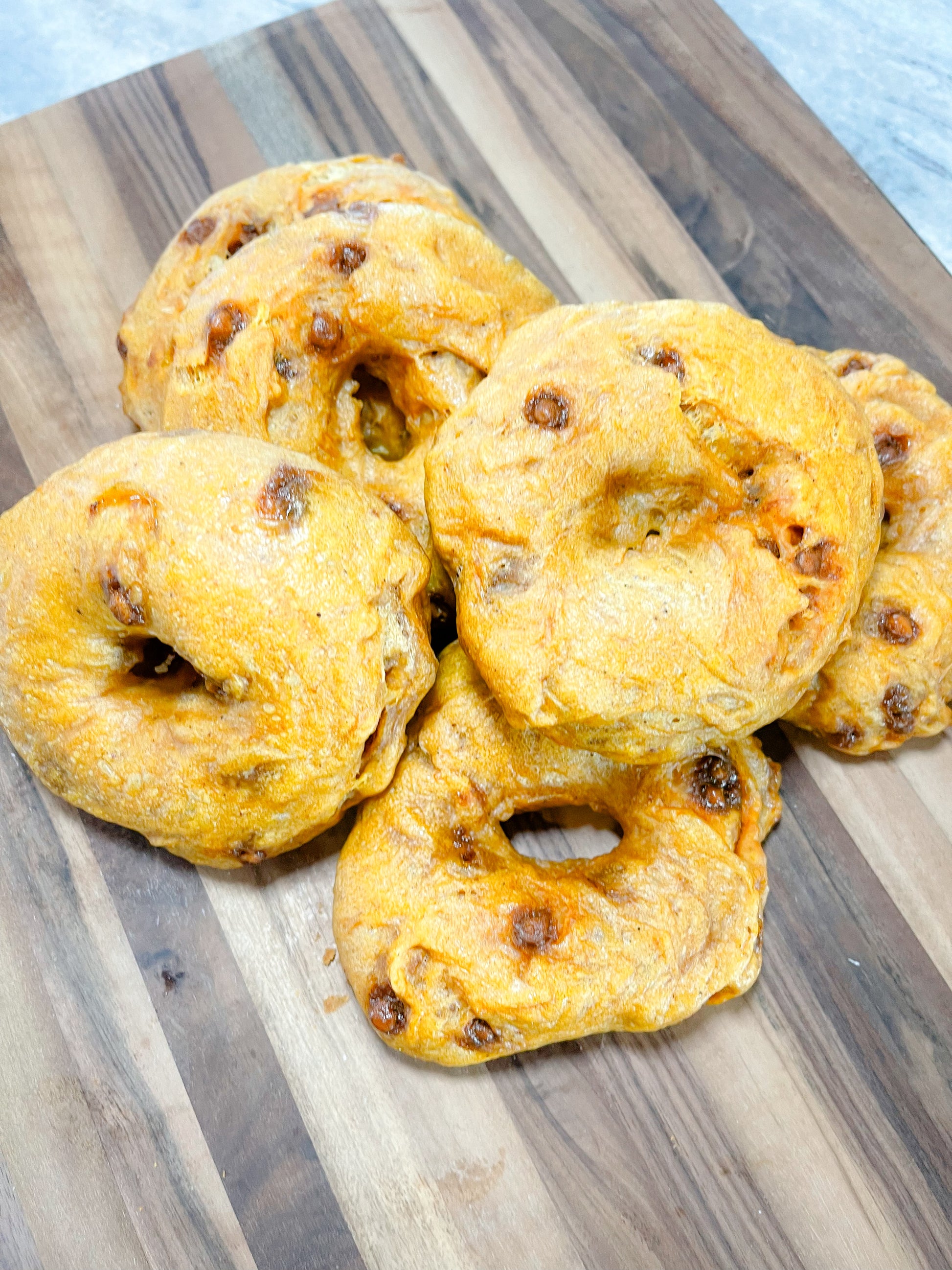 CINNAMON CHIP PUMPKIN SPICE BAGELS INGREDIENTS: All Purpose Flour (Unbleached Hard Red Wheat Flour, Malted Barley Flour), Water, Brown Sugar, Pumpkin Pie Spice (Cinnamon, Ginger, Nutmeg, Allspice, Mace, Cloves), Salt, Pumpkin Puree, Cinnamon Baking Chips